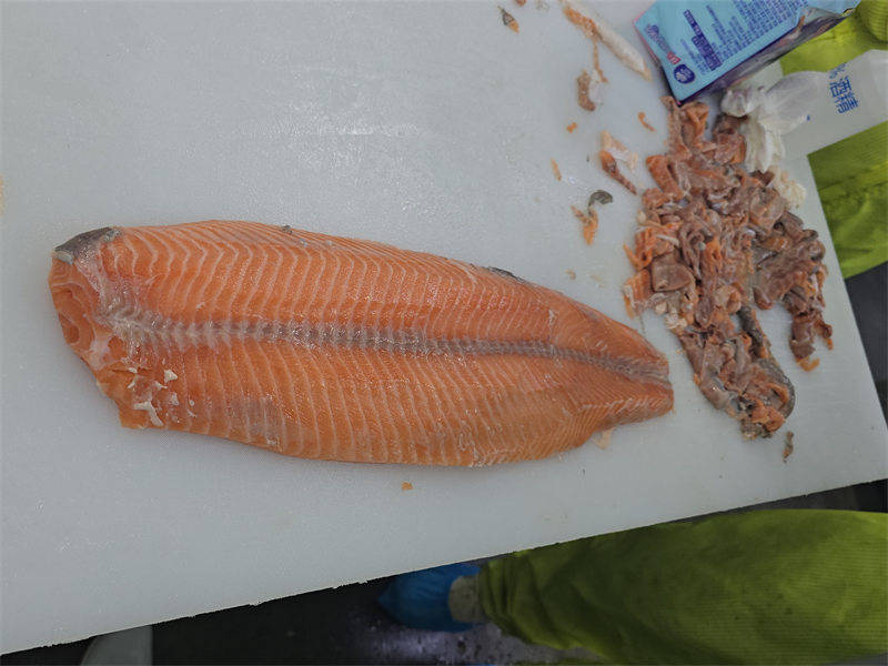 近日,祥九瑞盈食品设备技术团队赴某食品加工厂完成电动三文鱼油脂层修整器的安装调试与操作培训,成功以智能化设备替代传统人工刀切工艺,为三文鱼加工环节注入高效节能新动能。